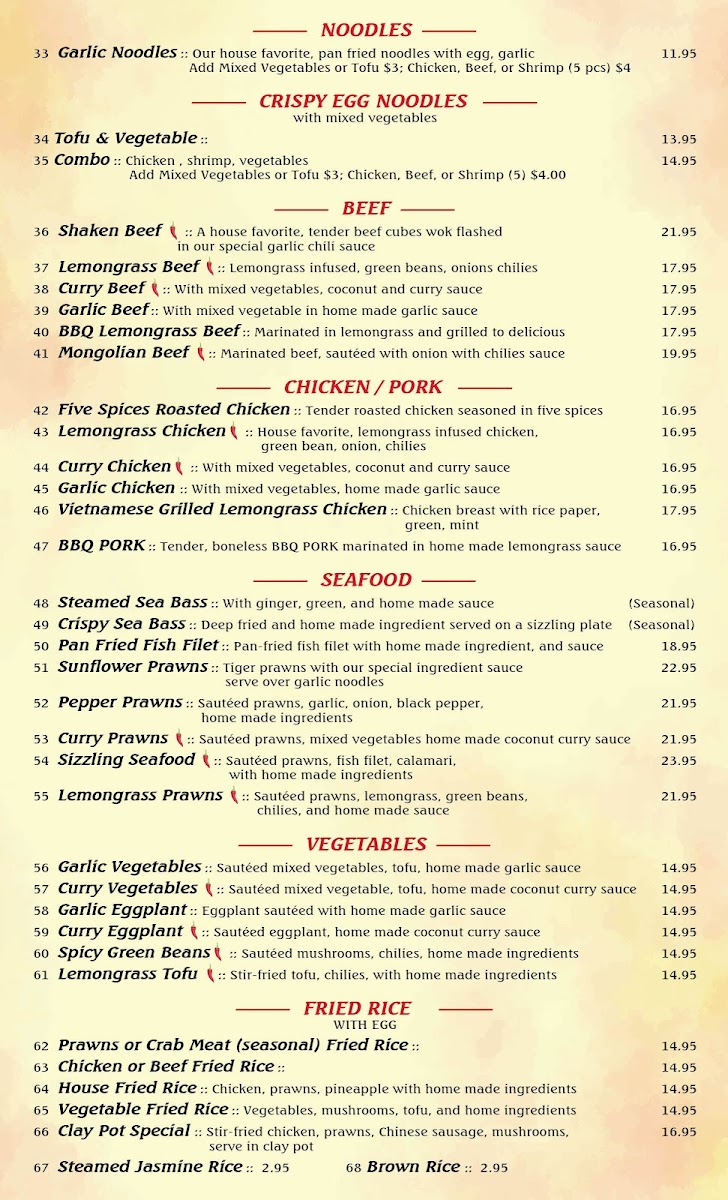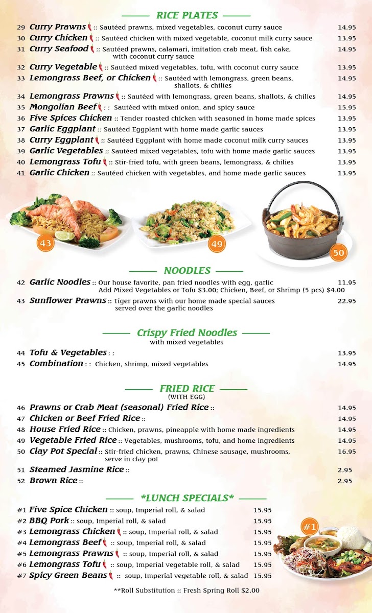 With a menu boasting an impressive range of dishes, Sunflower specializes in comforting, hearty meals that resonate with authenticity and quality. From the moment you step inside, the aroma of fresh ingredients fills the air, setting the stage for a delightful feast. Their Fried Rice dishes are particularly noteworthy; the House Fried Rice combining chicken, prawns, and pineapple creates a perfect harmony of sweet and savory. For those craving something a bit spicier, the Curry Chicken, rich with coconut milk and bursting with flavor, is sure to ignite your taste buds. Each plate is not just food; it’s an experience crafted with love and homemade sauces that reflect the chef’s dedication to quality.